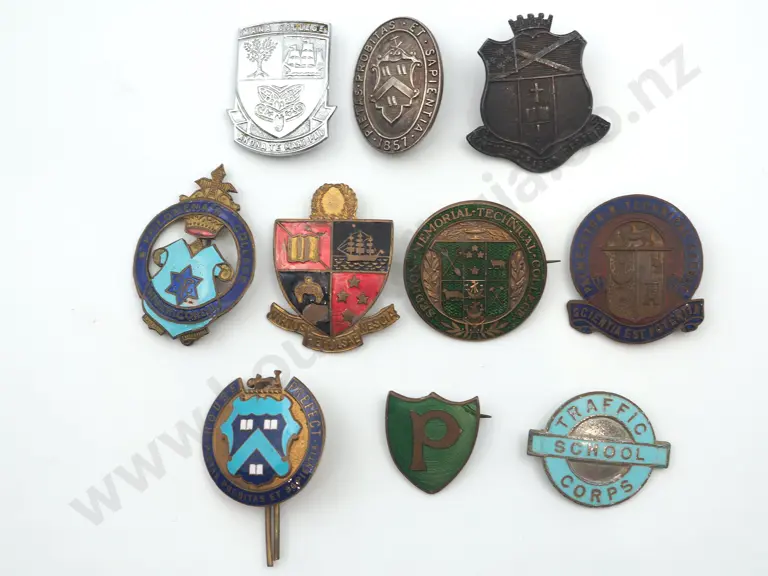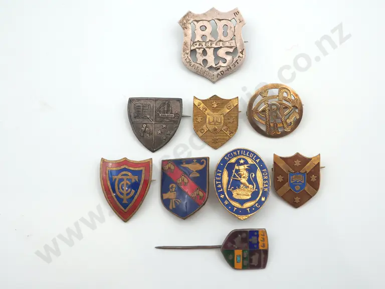 9 x different New Zealand antique and vintage metal school and college badges and pins