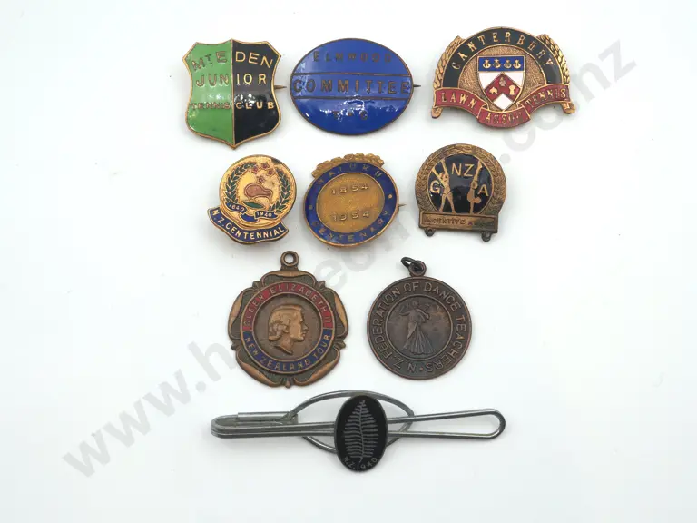 9 x different vintage metal New Zealand badges, clips and pins.