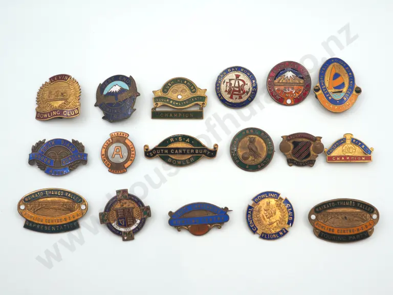 17 x different vintage New Zealand metal and enamel bowling club badges.