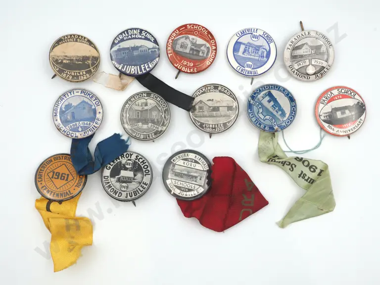 13 x different tin badges commemorating New Zealand schools Jubilees, Centennials or Anniversaries