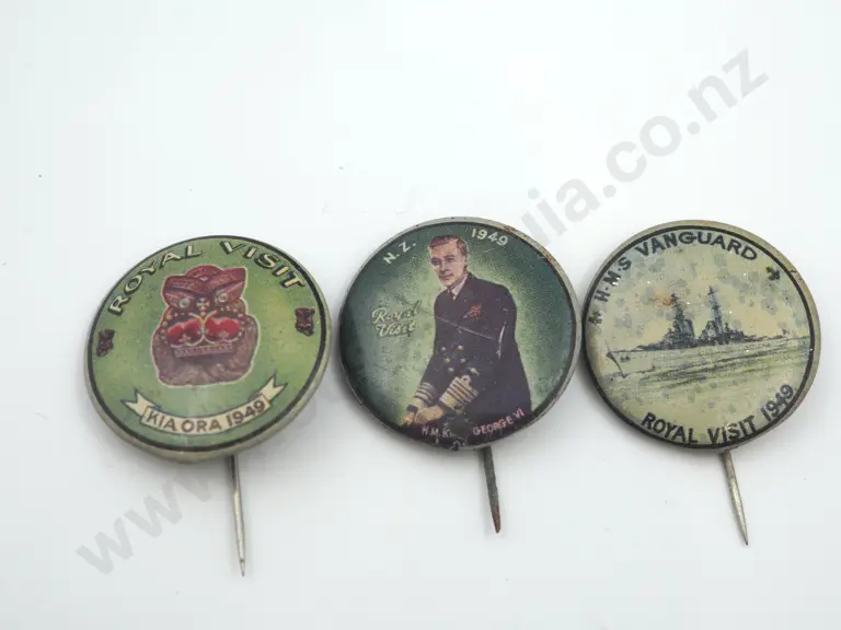 3 x tin badges produced for the proposed visit of King George VI to New Zealand in 1949