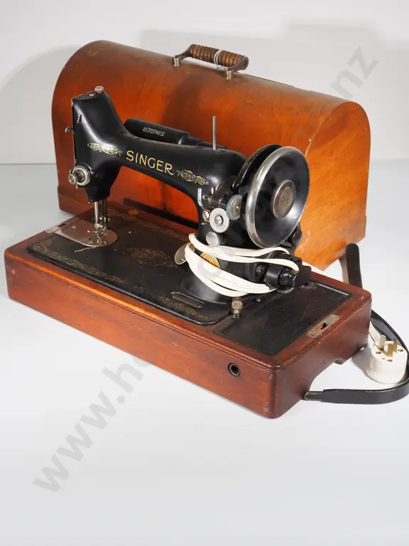 Vintage Portable Singer Sewing Machine in Original Wooden Box: Appears Complete Estimate: $60 - $80
