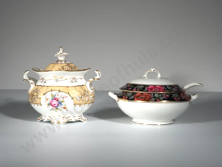 Two Decorative Lidded Tureens Floral Motifs w Extensive Gilding: One w Original Spoon. Estimate: $60 - $80