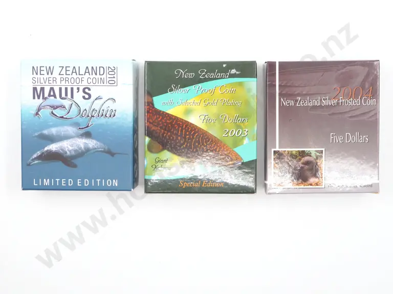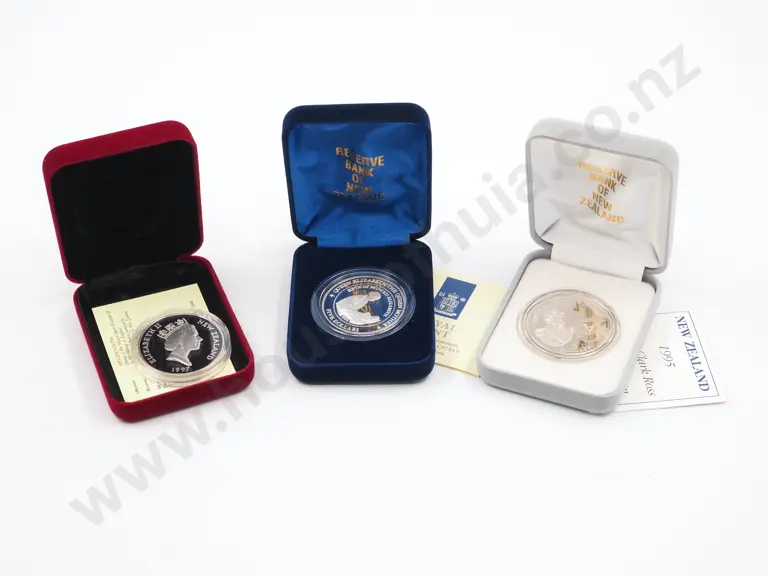 3 New Zealand Cased Silver Proof $5 Dollar Coins Total CV $340 NZD Estimate: $200 - $300