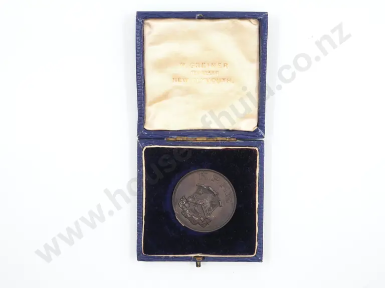 Cased 1914 New Plymouth High School Sports Medal to R M Rockell: In Original Case of Issue by N Greiner Jeweller Estimate: $60 - $80