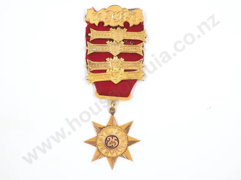 UFBA New Zealand 25 Year Service Star w Four 2 year Medal Bars in 9ct Gold: Awarded to E J Craig Dunedin 1945 Estimate: $1,200 - $1,600