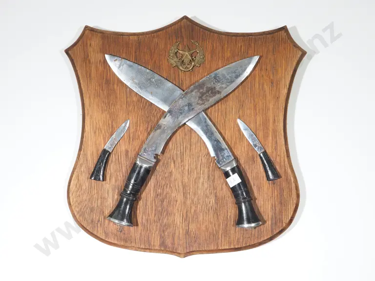 Two Crossed Kukhri Daggers on Wooden Presentation Plaque with a Ghurka Cap Badge Estimate: $120 - $180