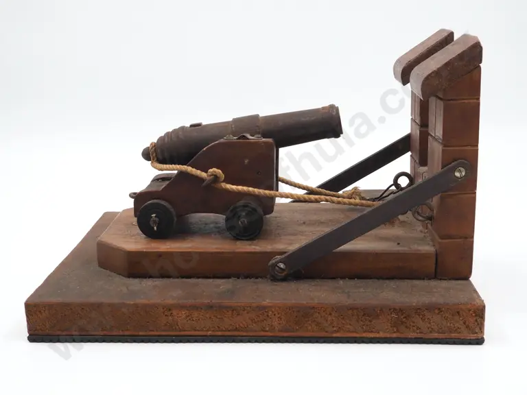 Cast Toy Cannon in Wooden Fortress: Comes with lot of Lead Cannonballs Estimate: $80 - $120