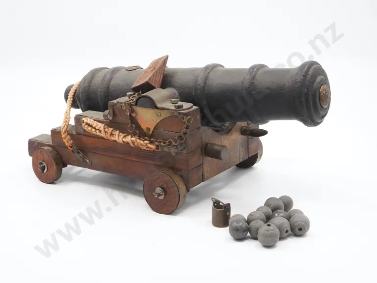 Large Toy Cannon in Detailed Mount w Chocks, Cannonballs, Cleaning & Ram Rods 1 Inch Bore Estimate: $250 - $350