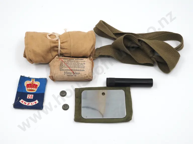 Assorted lot of Military Items: SLR Oil Bottle / 1980s Military Sewing Kit / WW2 Field Dressing/ Cloth Patch / Mirror Estimate: $60 - $80