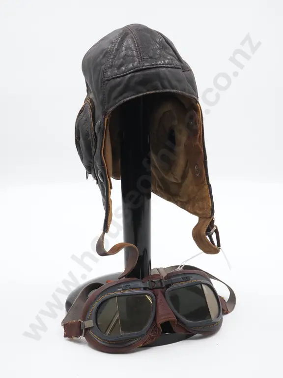 WW2 RNZAF Flying Helmet B Type w Non Matched Mk 8 Goggles on Hat Stand Estimate: $120 - $150