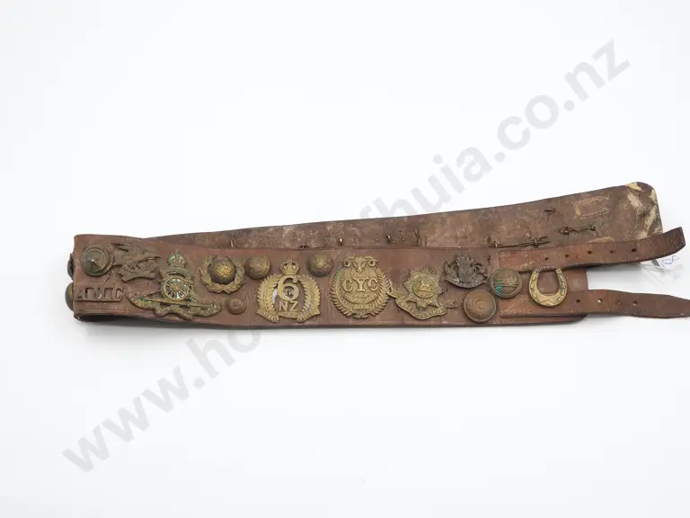 Unique WW1 Souvenir Leather Belt w Assorted Cap Badges Estimate: $200 - $300