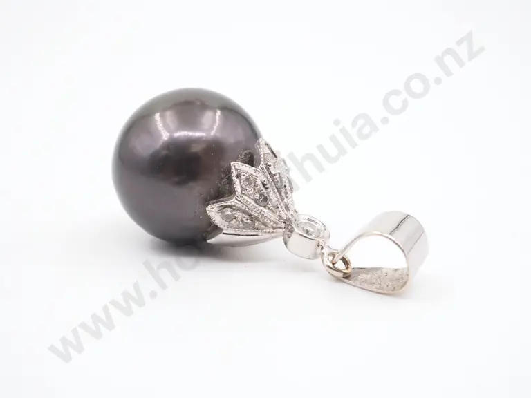 Modern 18ct White Gold Black Pearl & Diamond Pendant: Valued at $2600.00 Estimate: $600 - $800