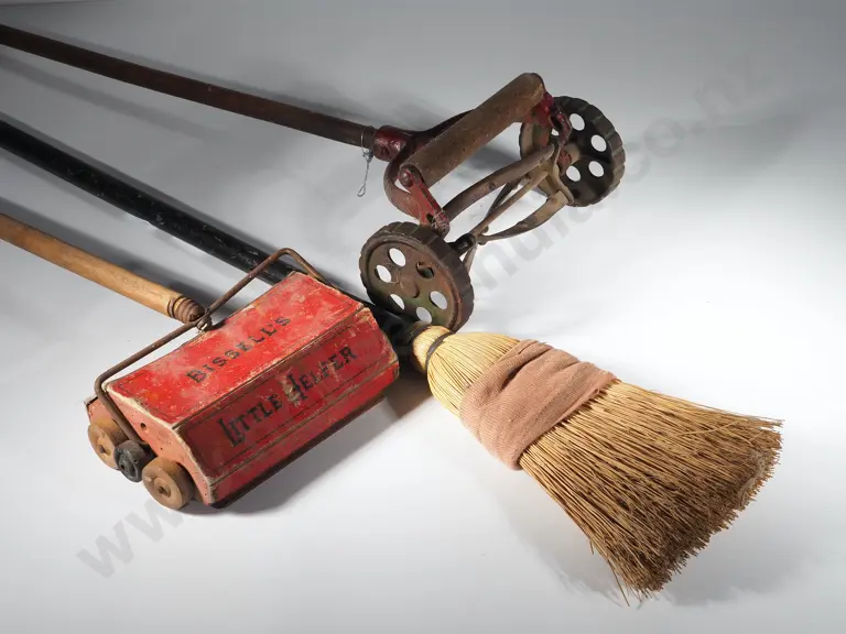 Lot of Three Vintage Life Size Replica Children's Tools: Carpet Sweeper/Broom/Lawnmower Estimate: $60 - $80