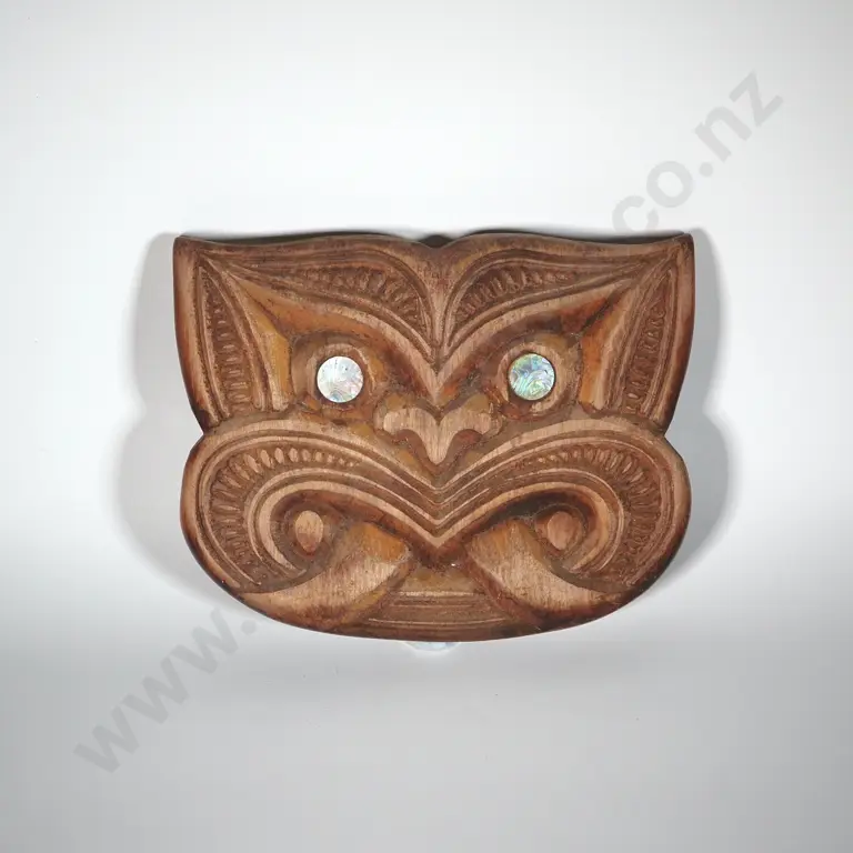 Vintage Maori Wood Carved Face With Paua Shell Eyes