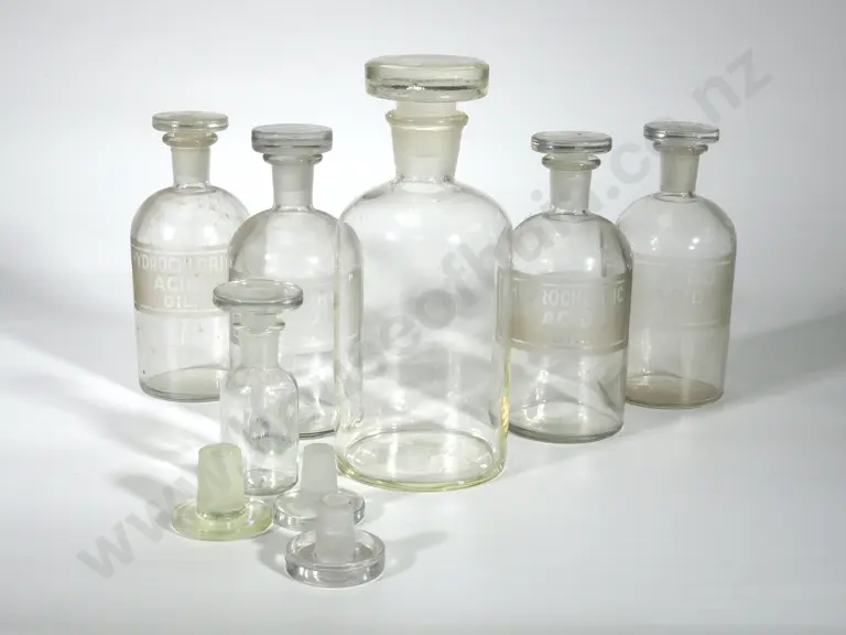 Large Assorted Lot of Glass Pharmacy Bottles (2 Labelled Hydrochloric Acid & Nitric Acid) Estimate: $60 - $80