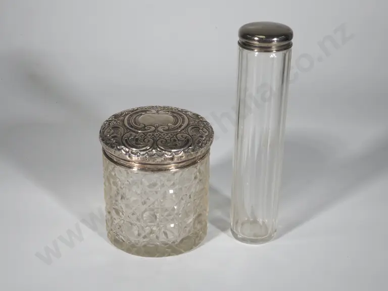 Antique Sterling Silver Cut Glass Dressing Table Jar & Silver Plate Topped Hatpin Container Estimate: $80 - $120