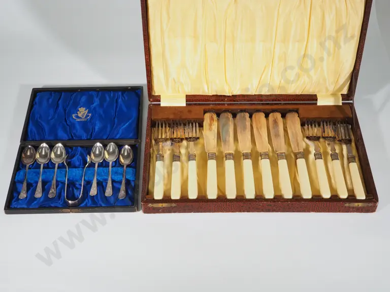 Six Boxed S/P Teaspoons & Sugar Tongs & Six Bone Handled Fish Knives & Forks Estimate: $60 - $80