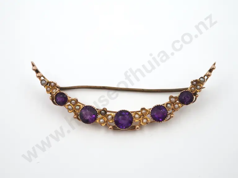 9ct Gold Amethyst & Seed Pearl Crescent Brooch Estimate: $240 - $300