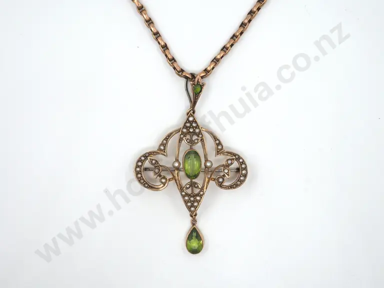 9ct Gold Antique Belcher Chain w/ Peridot & Seed Pearl Pendant Circa 1920 Estimate: $1,000 - $1,200