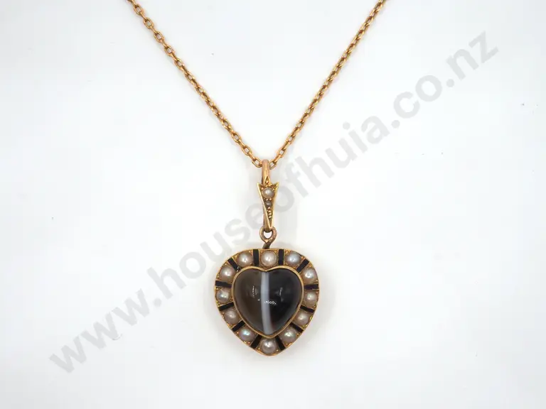 18ct Gold French Agate & Seed Pearl Enameled Heart Pendant on 18ct Fine Gold Chain Estimate: $800 - $1,200