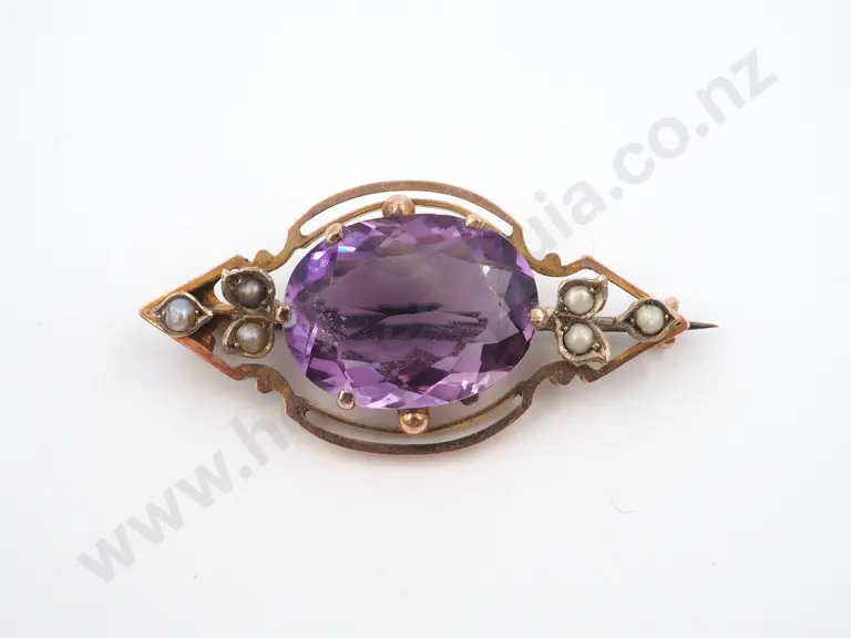 9ct Gold Edwardian Large Amethyst & Seed Pearl Brooch Estimate: $250 - $350