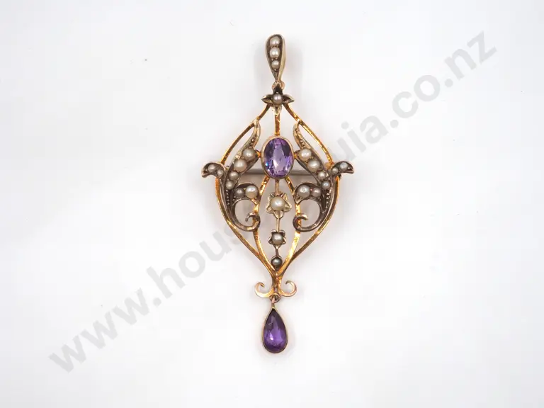 9ct Gold Antique Seed pearl & Amethyst Pendant Brooch, Circa 1920 Estimate: $400 - $500
