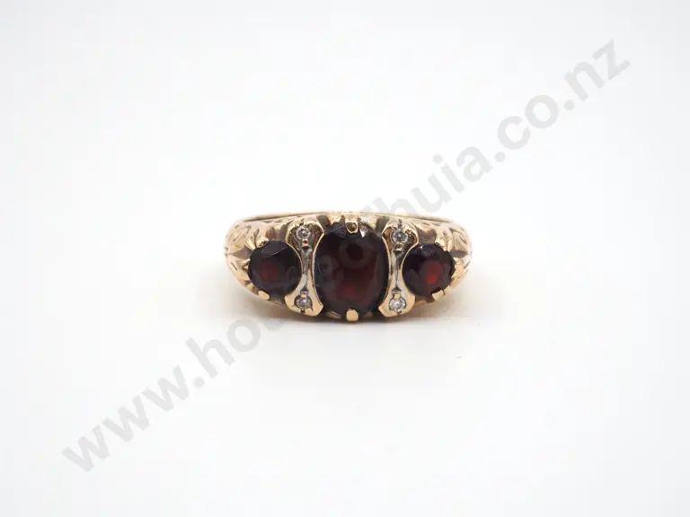 9ct Gold Ornate Three Stone Garnet Ring Estimate: $250 - $350