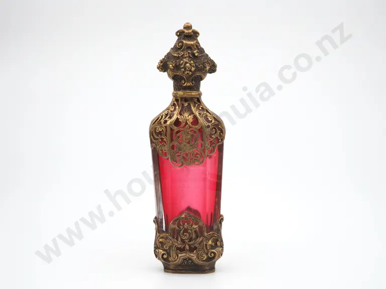 Antique Ornate Silver Gilt Ruby Glass Scent Bottle Complete w/ Stopper Estimate: $500 - $700