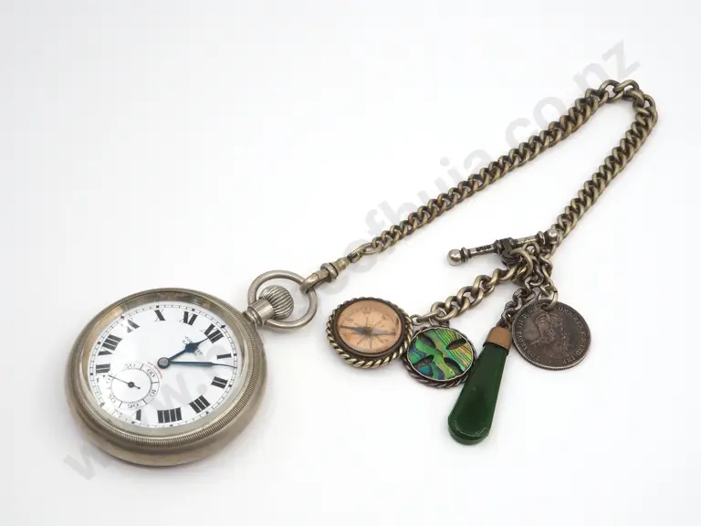 Sterling Silver Joe Reid Oamaru Pocket Watch on Silver Gilt Fob Chain w/ Charms Estimate: $180 - $220