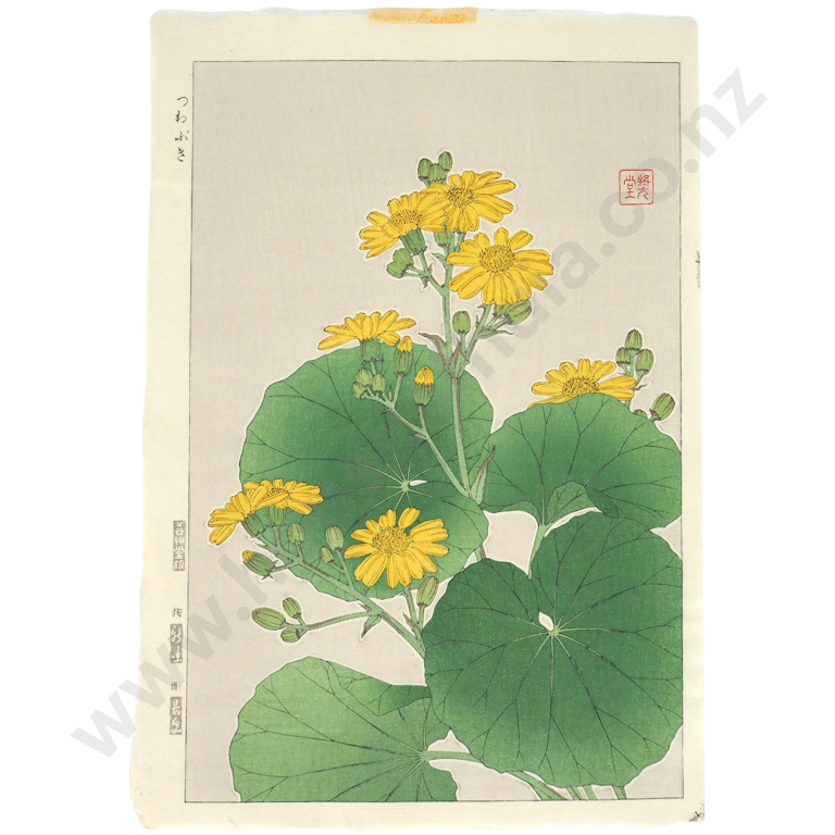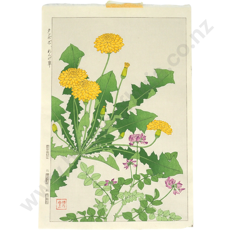 Shodo Kawarazaki. 1889-1973. Japanese Dandelion & Milkvetch Wood Block Print.