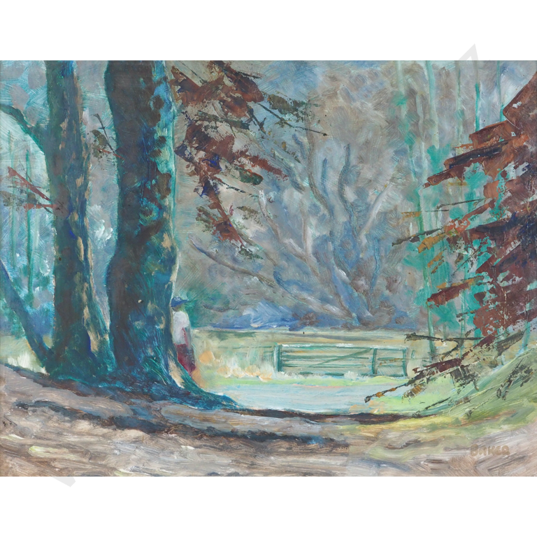 Gordon Baker. An Assignation - Boy w hands in Pockets Waiting Expectantly Beside Large Tree.