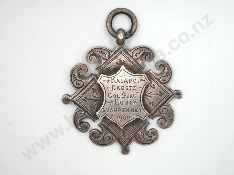 Kaiapoi Cadets 1900 Champion Shot Silver Fob Medal to Col Serg Hunt Estimate: $80 - $120