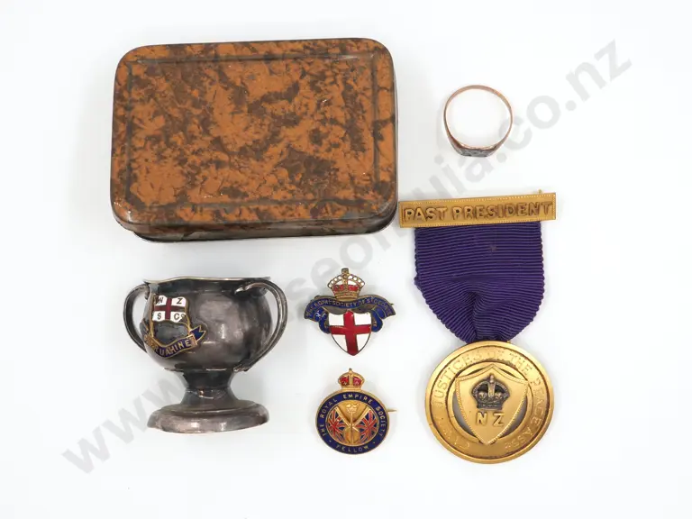 Assorted Lot: Past President CHCH Justice of the Peace Medal / Badges / 9ct Gold Masonic Ring / SS Ruahine Trophy Estimate: $200 - $300