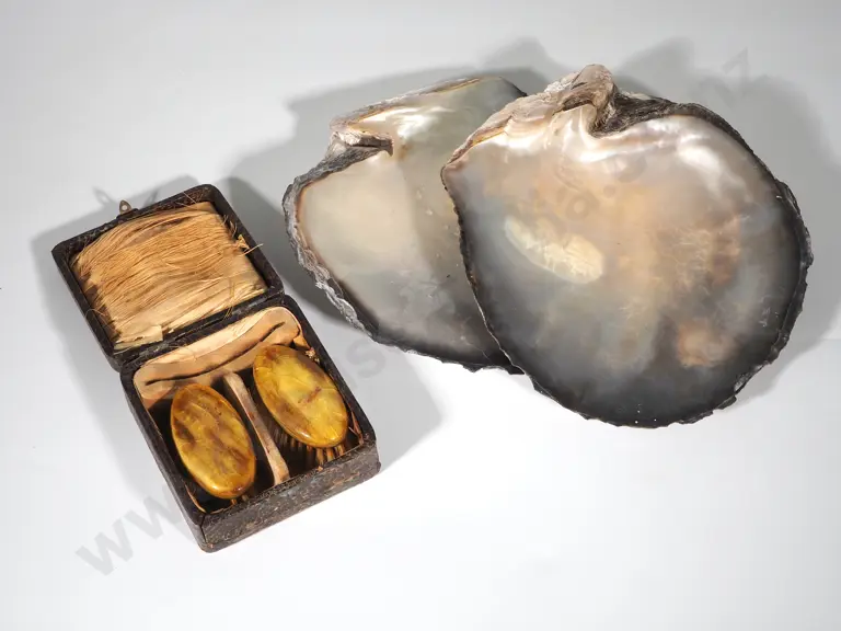 Vintage Faux Snakeskin Box w Two Brushes & Two Very Large Silver-Lipped Mother of Pearl Shell