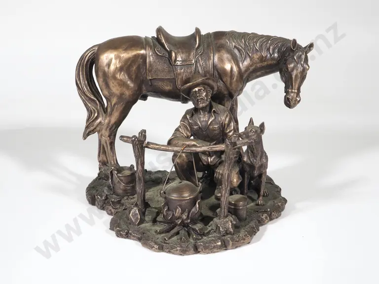 Bronzed Resin Sculpture: Man w Horse & Dog Estimate: $50 - $100