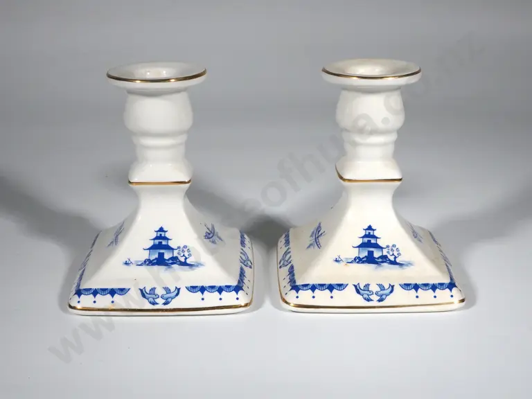 Two Royal Winton Blue & White Candlesticks w Oriental Style Decoration