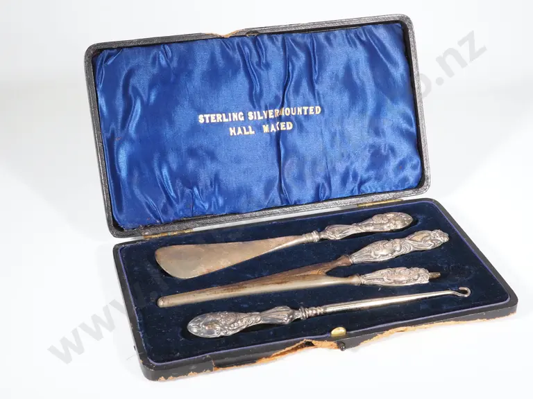 Antique Cased Sterling Silver Shoe Horn, Boot Hook and Glove Stretcher Set A/F Estimate: $60 - $100