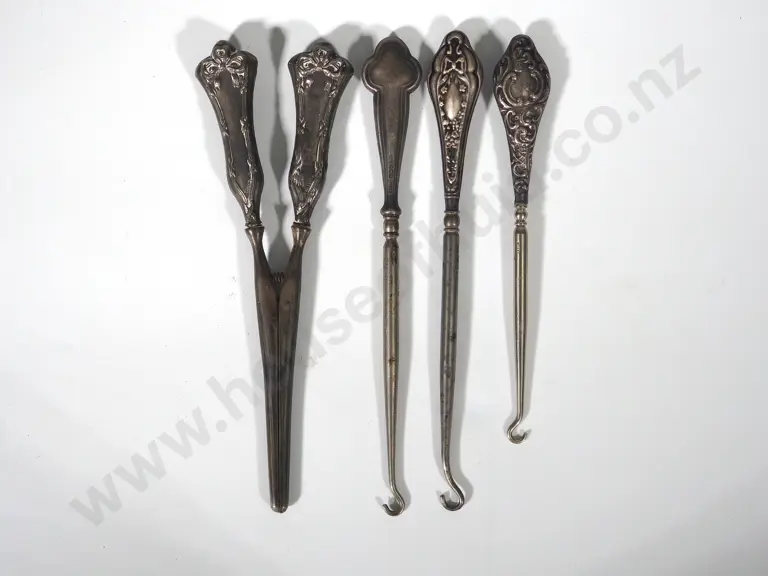 Three Silver Plated Boot Hooks & One Pair of Curling Tongs Estimate: $20 - $40