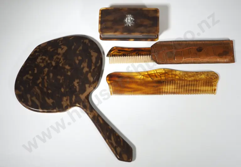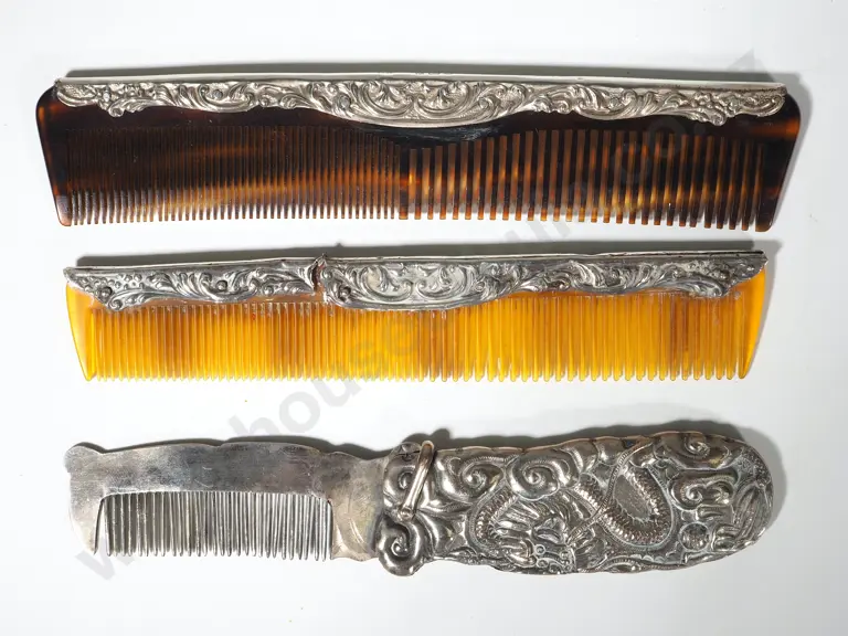 Faux Tortoiseshell Hand Mirror, Combs, and Initialled Silver Lidded Box Estimate: $30 - $60