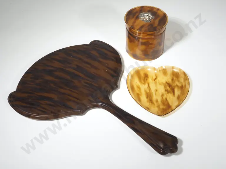 Faux Tortoiseshell Hand Mirror, Heart Shaped Dish and Initialled Lidded Toilet Jar