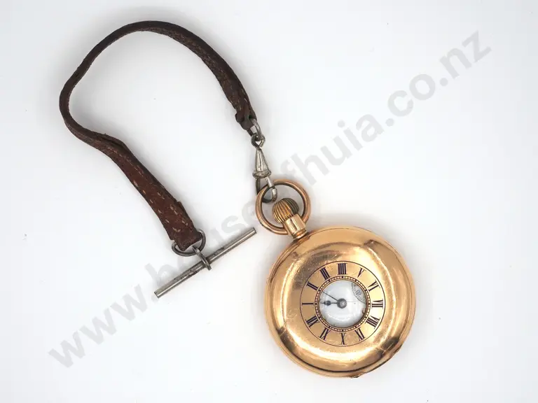 One Rolled Gold Hunter Pocket Watch w Strap Estimate: $200 - $300