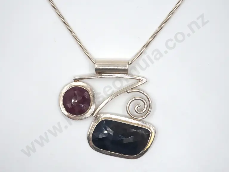 Deocrative Sterling Silver Hand Made Pink & Blue Corundum Necklace - Marked LRS Estimate: $200 - $300