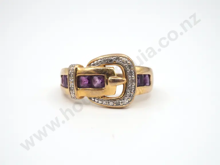 9ct Gold Buckle Ring w Diamonds & Amethyst Estimate: $200 - $300