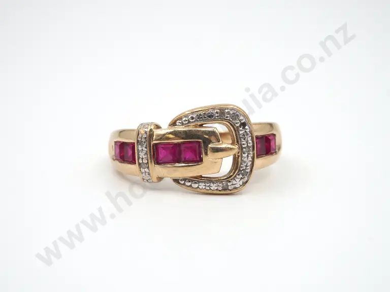 9ct Gold Buckle Ring w Diamonds & Synthetic Rubies Estimate: $250 - $350