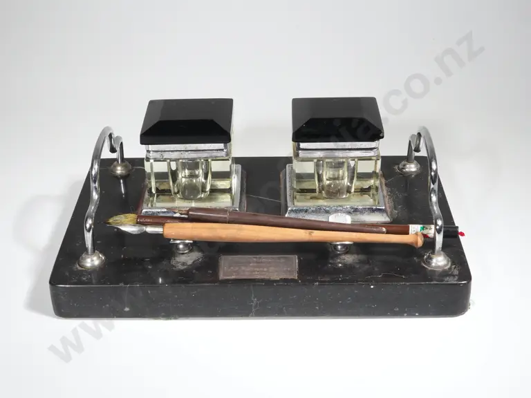 Art Deco Desk Set - Chrome & Black Glass Ink Wells l On Black Marble Stand w Sterling Silver Presentation Plaque Estimate: $100 - $200