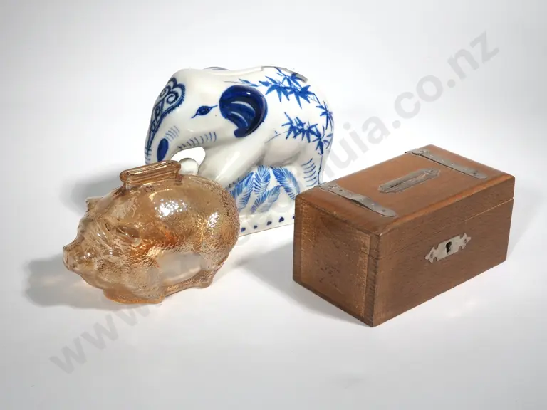 Three Money Boxes Including a Lustre Pig, Blue & White Elephant & A Wooden Box Estimate: $40 - $60
