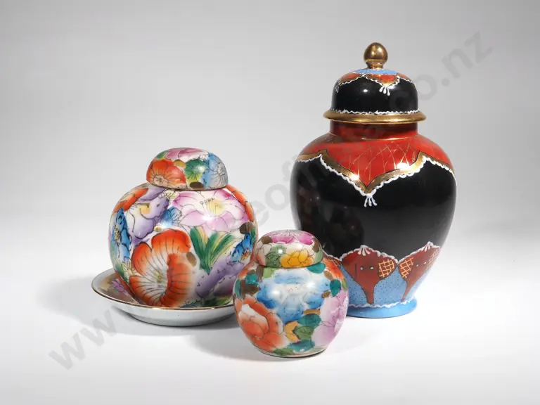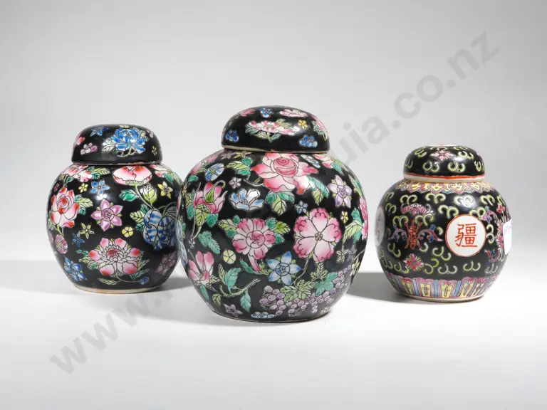 Three Lidded Oriental Design Ginger Jars w Black Ground Estimate: $60 - $80