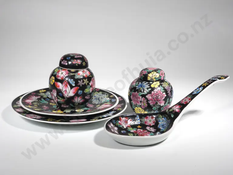 Two Lidded Ginger Jars, w Two Matching Plates & One Spoon Rest Estimate: $80 - $100
