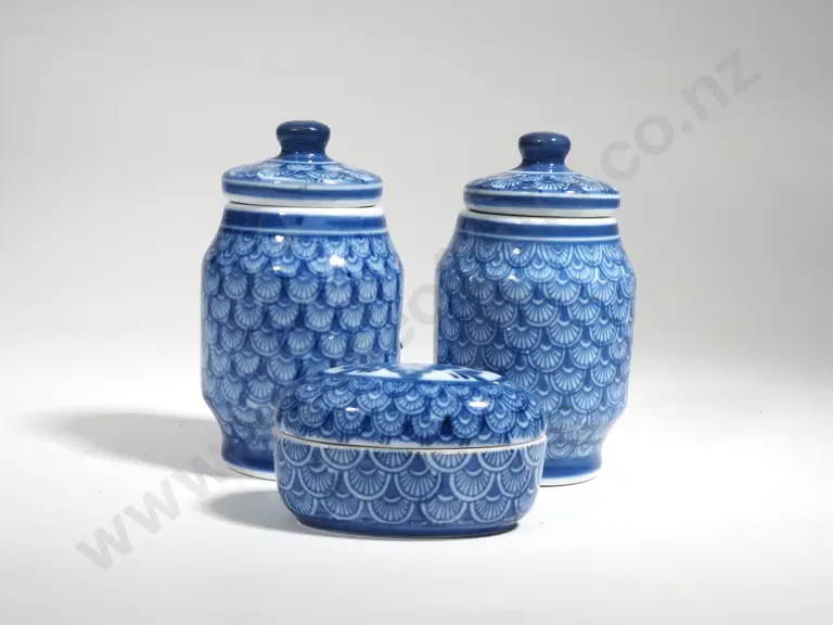 Three Blue & White Lidded Fish Scale Jars Estimate: $30 - $50